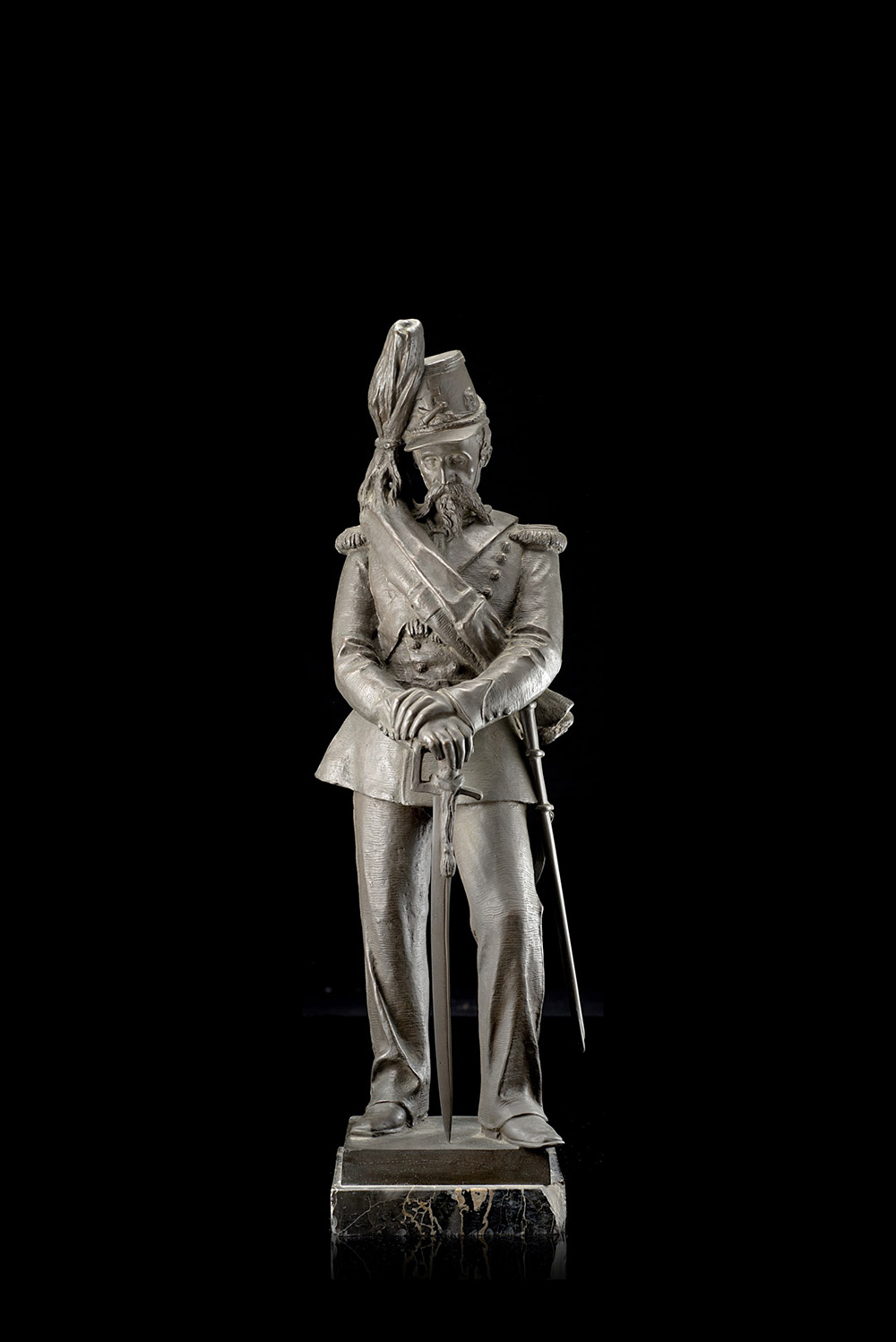 Scultura in bronzo raffigurante un militare dell'artiglieria a cavallo in uniforme della campagna delle Prima Guerra d'Indipendenza del 1848 (h cm 60) con base in marmo (difetti e mancanze)