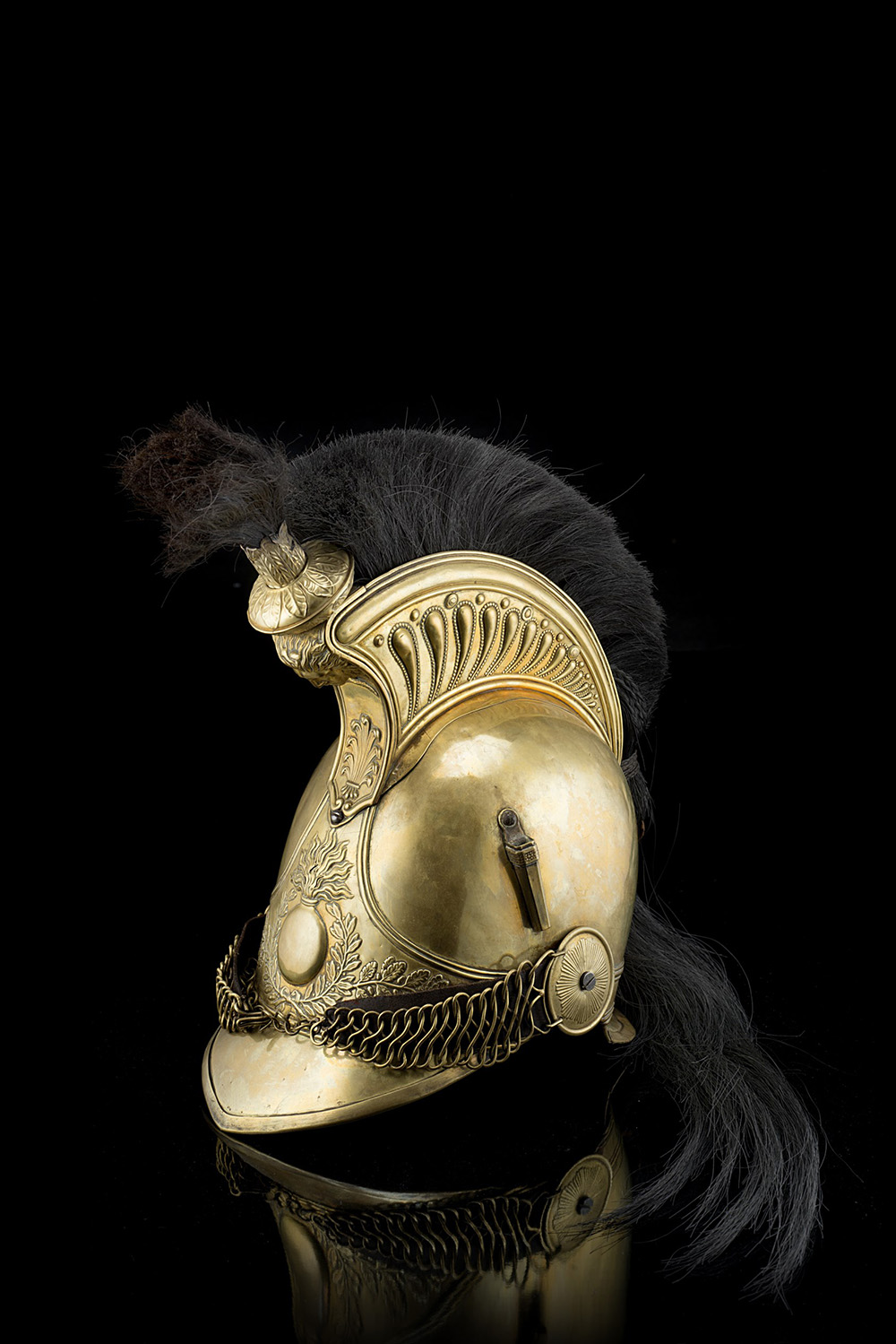 Elmo in ottone dorato, coppo alla minerva, banda frontale con a rilievo granata fiammeggiante contornata da foglie di quercia e di alloro, cimiera con al centro testa di medusa aggettante e palmette, decoro di gocce perlinate sui fianchi. Ciniglia a spazzola in crine di cavallo, visiera a becco, rosoni a raggiera e soggioli a catane a forma di otto, interno in pelle a denti di lupo. Punzone 28, numero di produzione 279, inciso Reclus sul bordo interno della gronda (h. cm 38)(difetti)