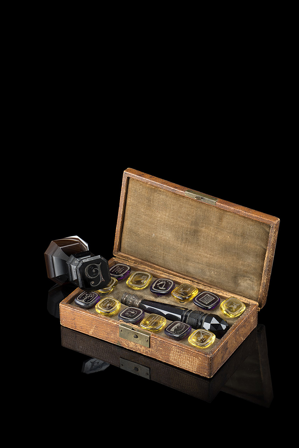 Lotto composto da curioso astuccio ricoperto in marocchino contenente un manico e tredici sigilli in pietra dura intercambiabili, unito ad un sigillo in pietra dura. Francia, inizio sec. XIX (cm 11,5x7) (difetti)
