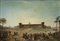 Inizio sec. XIX "Napoleone a cavallo attorniato dallo Stato Maggiore mentre si reca alla parata dell'esercito del Regno d'Italia schierato nella spianata di fronte al Castello Sfrozesco di Milano. In primo piano, il Popolo milanese e due dragoni a cavallo" Olio su tela (cm 64x94) firmato in basso a sinistra. Interessante documento storico databile attorno al 1807 (lievi difetti)