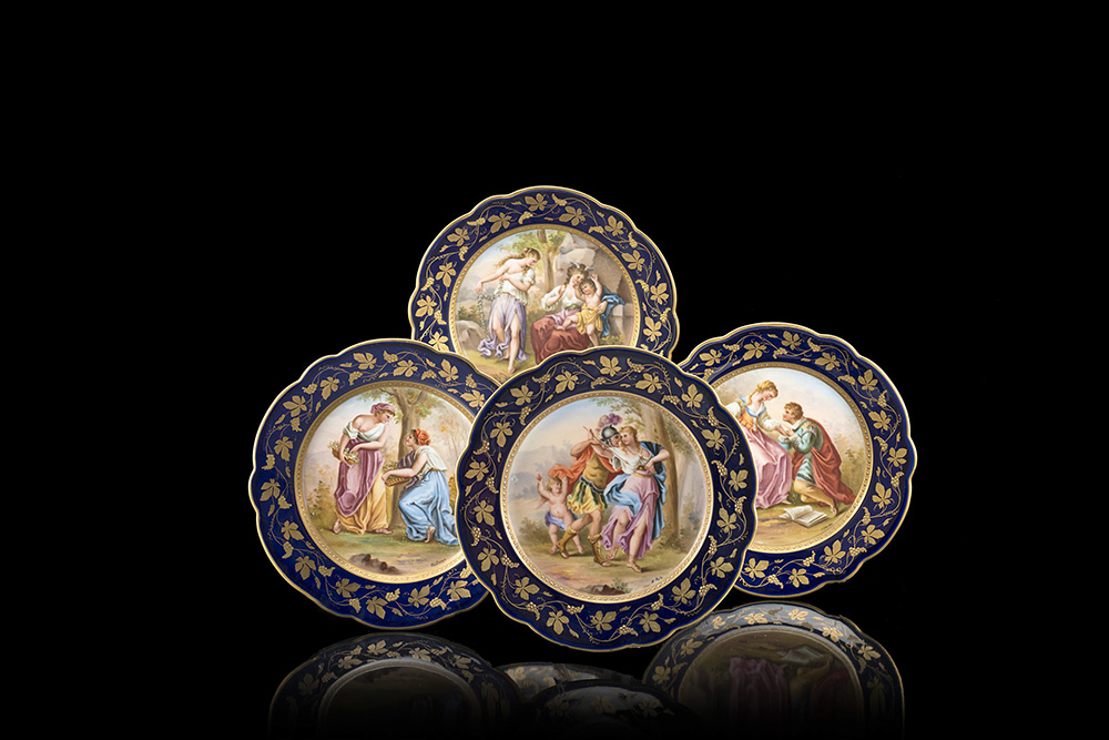 Quattro piatti mistilinei in porcellana con ricco bordo blu profilato e decorato in oro a foglie e grappoli di vite. Il cavetto reca un medaglione a ovuli a rilievo in oro e, all'interno, quattro scene dipinte tratte dalla letteratura: ‘Rinaldo e Armida’, ‘Romeo e Giulietta’, ‘Sommer’ e ‘Genius’. Tre medaglioni sono firmati. Sul retro, compare la marca di fabbrica e il titolo del soggetto dipinto. Vienna, inizi sec. XX (d. cm 21)