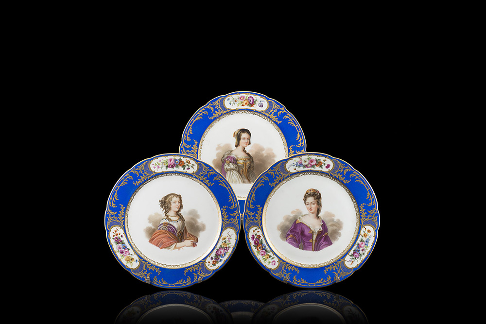 Tre piatti polilobati in porcellana policroma con ricco bordo a fondo blu profilato in oro e ricchi decori e riserve in oro rilevato e lavorato. L’interno delle riserve è dipinto con mazzi di fiori colorati mentre al centro del cavetto, profilato da pizzetto in oro, compaiono busti di gentildonne finemente dipinti. Sul retro, è tracciata in oro la firma dell’Atelier di pittura su porcellana Boyet de Feuillet. Parigi, fine sec. XIX (d. cm 25,5)