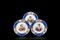 Tre piatti polilobati in porcellana policroma con ricco bordo a fondo blu...