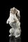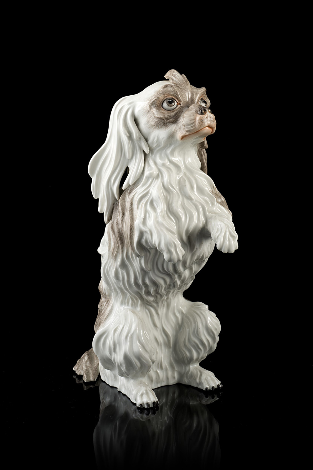 Piccola figura in porcellana policroma raffigurante un cane 'Cavalier King Charles' su due zampe (h. cm 27) Marca assente. Sotto al piede numerali dipinti in oro '99.' Fine sec. XIX - inizio sec. XX (difetti)