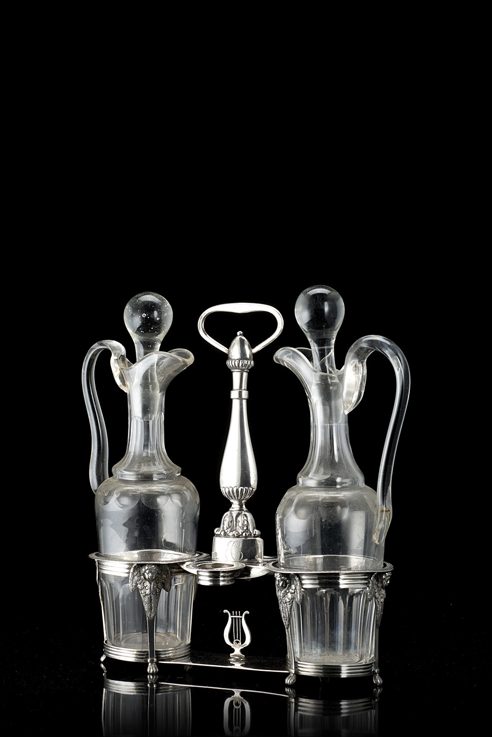 A silver cruet. Reign of Sardinia, Alessandria, 1830-73, silversmith Vitale Israel (l. cm 22xh. 25 ca.) (gr 370 ca.) (minor defects)