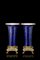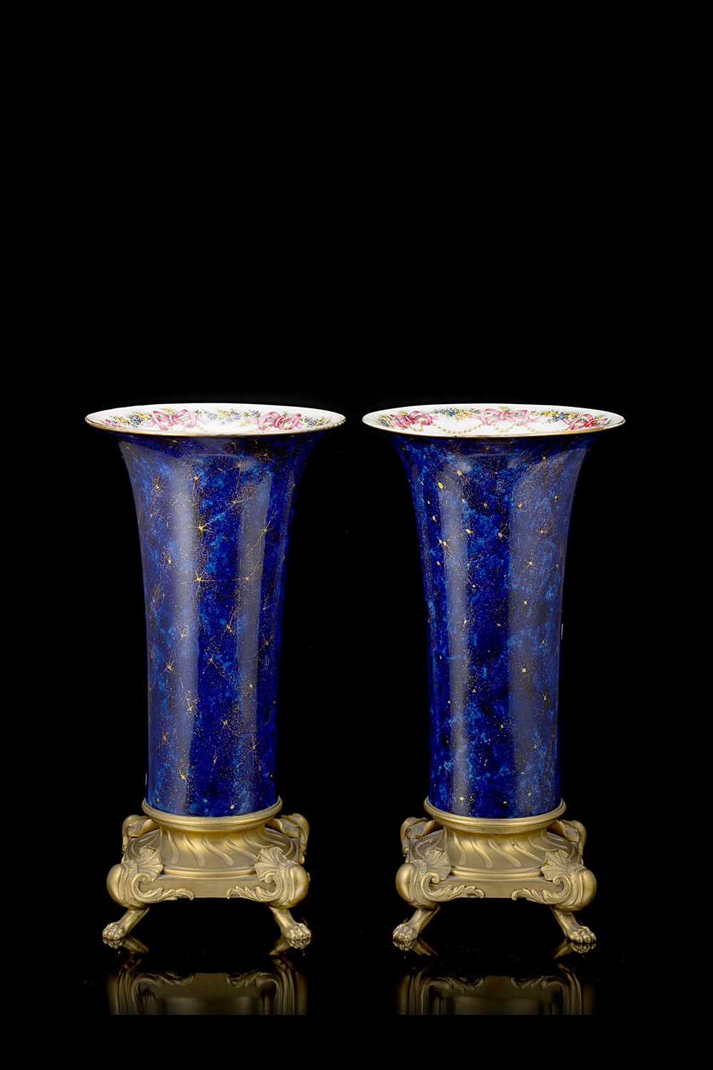 Manifattura di Sèvres, sec. XIX. Coppia di vasi a tromba in porcellana a fondo blu decorata a dorature. Montati su basi in metallo dorato di epoca posteriore (h. cm 42) L’interno in porcellana bianca arricchita da una ghirlanda floreale con fiocchi. Uno con marca di fabbrica a stampo in verde, e numerali (difetti)