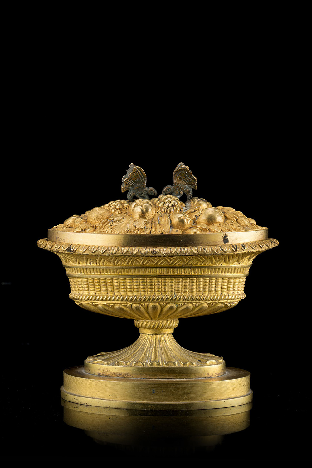 Calamaio in bronzo a forma di coppa ovale. Base cesellata con decori diversi, profilo a palmette. Coperchio a motivo di frutta con due animali alati. Sec. XIX (cm 14x14) (lievi difetti e mancanze)