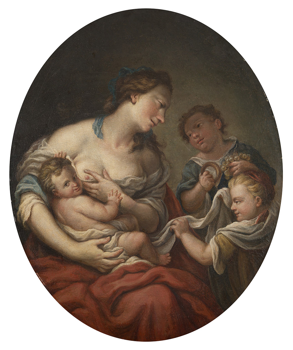 Circle of Giovanni Battista Pittoni, "Charity", oil on canvas (cm 121x99) framed (oval)