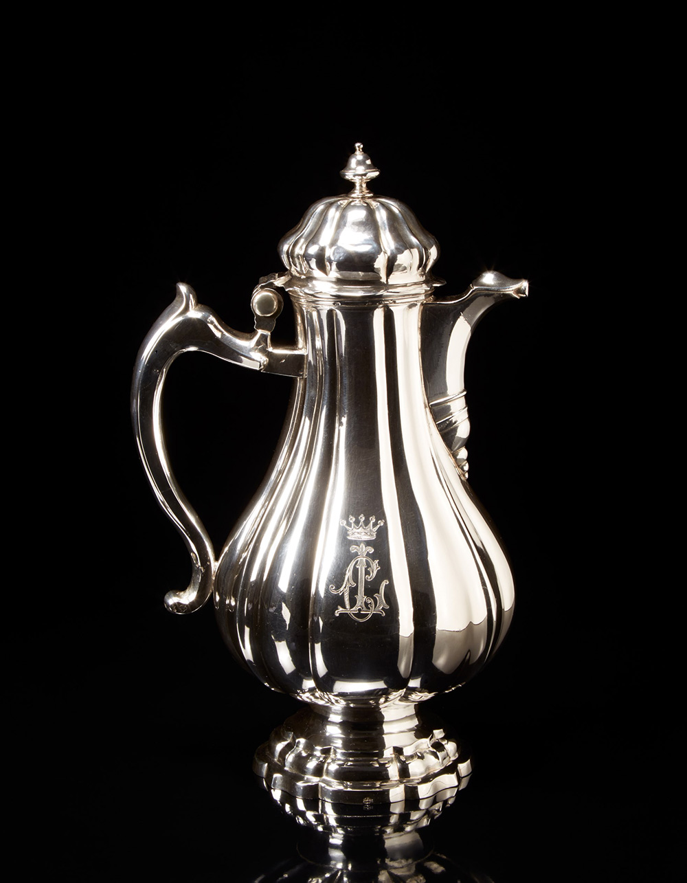 Versatoio in argento con piede circolare sagomato e gradinato, corpo piriforme con fesonature verticali che continuano sul coperchio a cupola bombata; beccuccio liscio sagomato e modanato; presa a trottola. Manico in argento ad arpa. Monogramma coronato inciso. Argentiere GBV in contorno trilobato. Verona, seconda metà sec. XVII (h. cm 32) (gr 1180 ca.) (difetti)