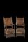 Coppia di seggioloni in noce con puntali intagliati a teste leonine. Gambe dritte unite da pannello scolpito a motivi stilizzati. Sedute e schienali in cuoio. Sec. XVI (difetti)