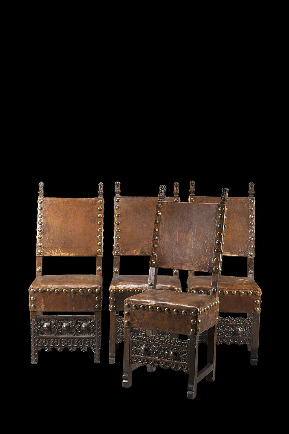 Gruppo di quattro sedie diverse in noce con puntali intagliati a motivi stilizzati. Gambe riunite da pannelli scolpiti. Sedute e schienali in cuoio. Sec. XVI (difetti)
