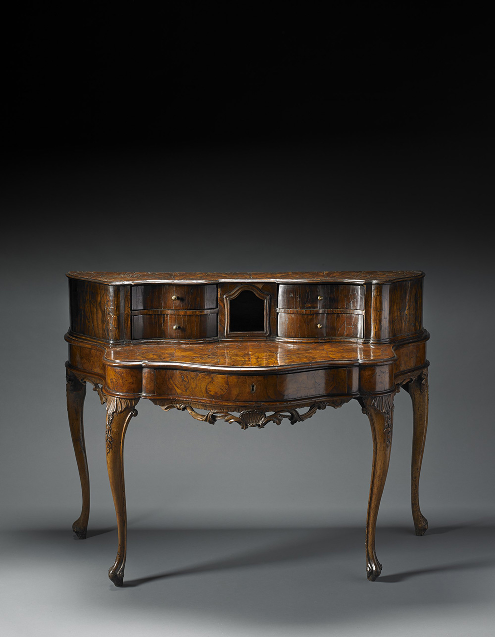 Scrivania di forma mossa in noce e radica, piano con alzata a quattro cassetti e vano centrale. Fascia ad un cassetto, gambe mosse intagliate a volute all'attacco e terminanti con piedi a ricciolo. Ferrara, sec. XVIII (cm 137x104x60) (restauri)