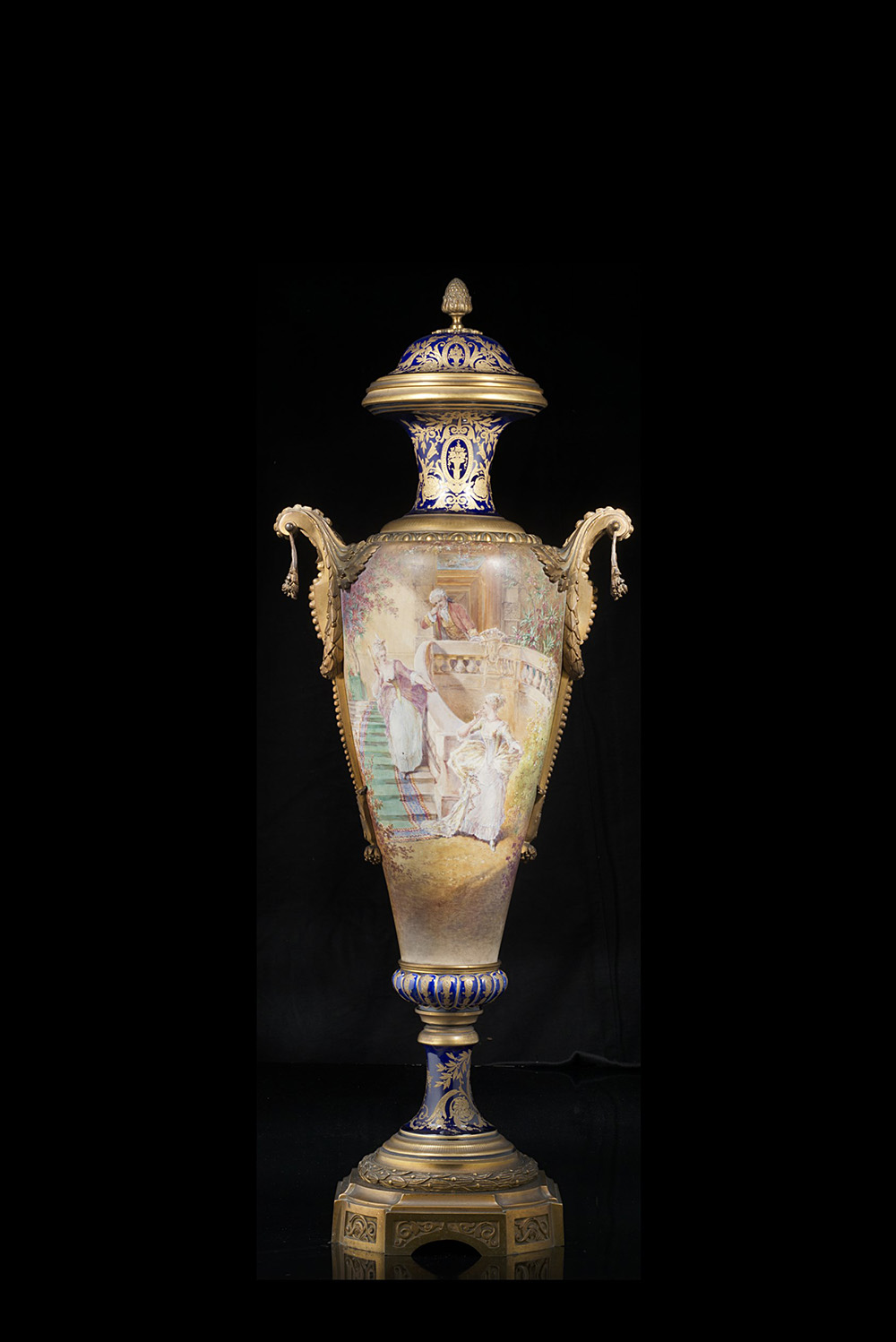Manifattura di Sèvres, inizio sec. XX. Grande vaso in porcellana decorato in policromia a scene settecentesche e a dorature su fondo blu. Anse, base e impugnatura in bronzo. Firmato Ch. Fuchs (h. cm 100) Marchi di fabbrica (lievi difetti)