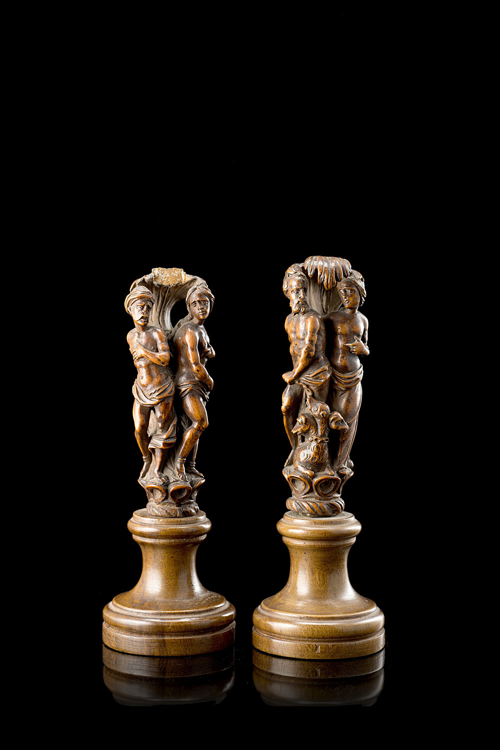 A pair of boxwood sculptures of divinities on plinths (h. cm 9) (losses)