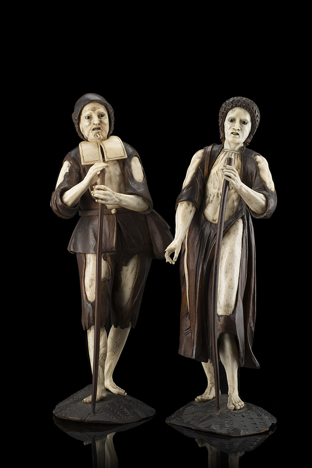 (Attributed to) A pair of walnut and ivory sculptures of peasants with glass eyes (h. cm 25) (losses)