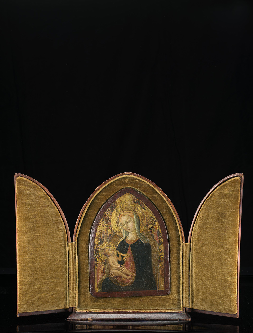 Maestro del secolo XVI "Madonna con Bambino" tempera su tavola a fondo oro (cm 30,5x22,5) in custodia con due ante (gravi difetti e restauri)