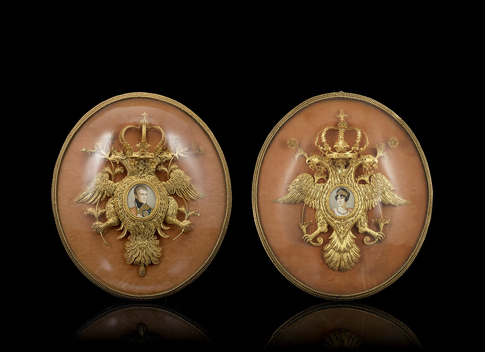 Manifattura austriaca, seconda metà sec. XIX. Coppia di miniature raffiguranti gentiluomo e gentildonna in importanti cornici in filigrana d'argento dorato ad aquile bicefale coronate con fiori tremblant, entro teche con vetri bombati e ghiere in vermeil (punzoni 800) (tot. cm 34x29) (difetti e restauri)