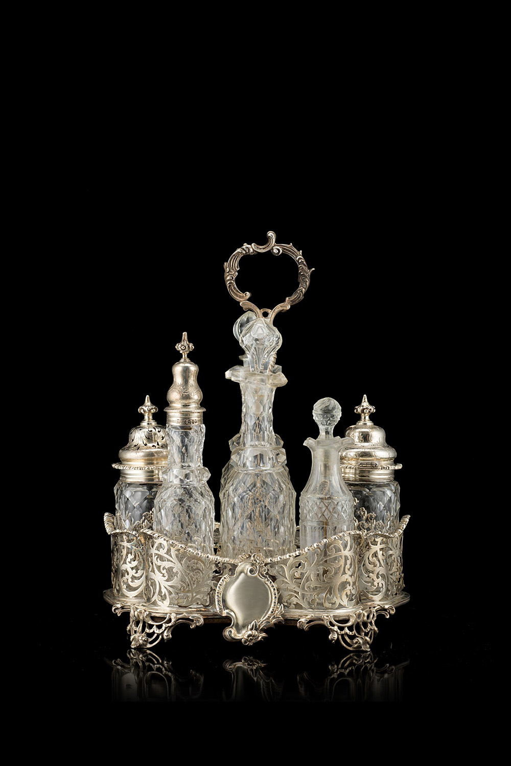 Cruet in argento di forma rettangolare sagomata con sponda e piedini traforati, cartigli applicati, presa a colonna con ghiera, decorati con volute fogliate e motivi fitomorfi; contenente sei flaconi in cristallo. Londra, 1863, argentiere George Fox (cm 21x15x26 ca.) (difetti e mancanze)