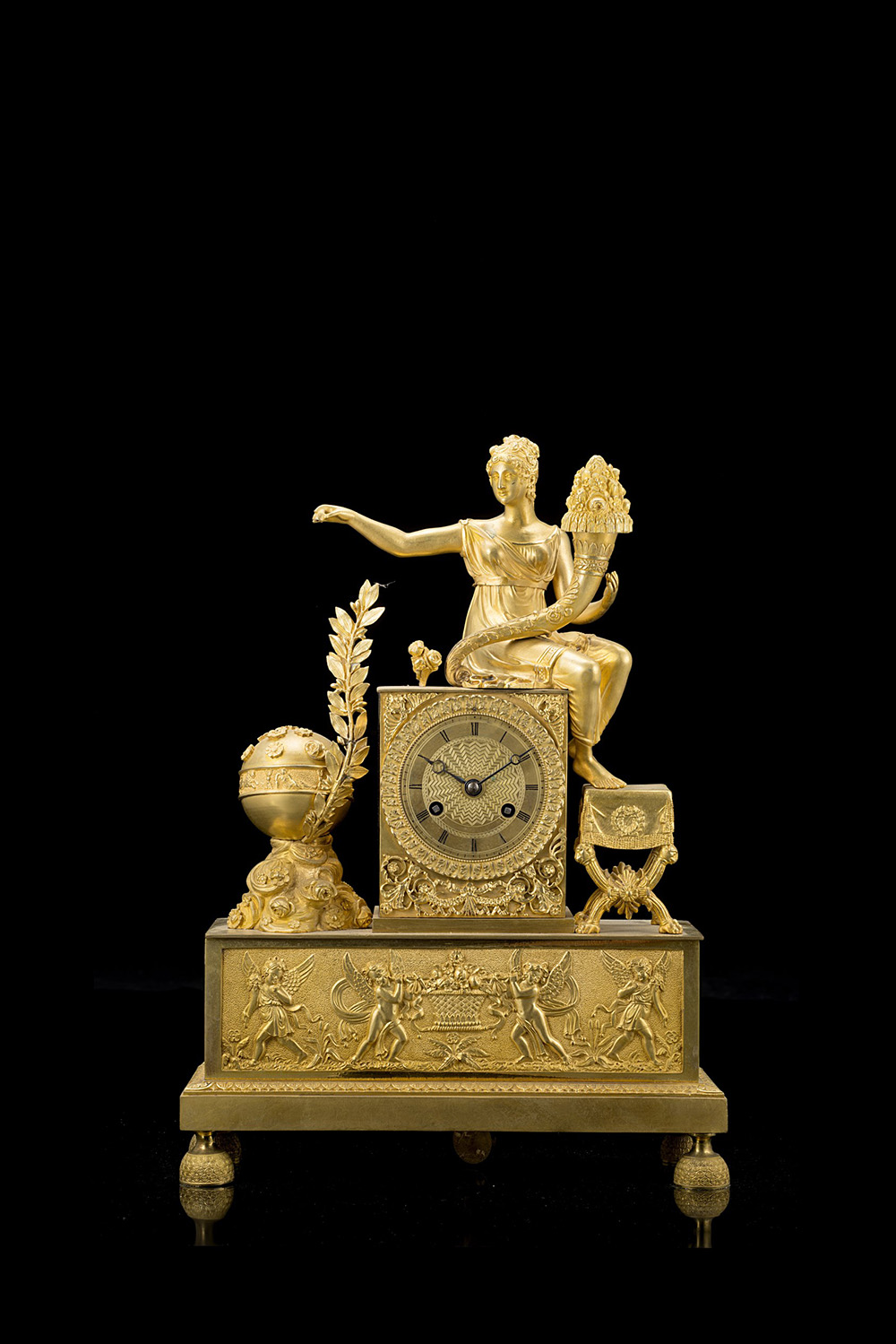 ANONYMOUS Ormolu mantel clock modelled as the allegory of Fortune Circa 1920/1925 Weekly wind movement, hour and half-hour stricking to bell Ormolu dial with Arabic numerals (cm 41x29x10,5) (defects)