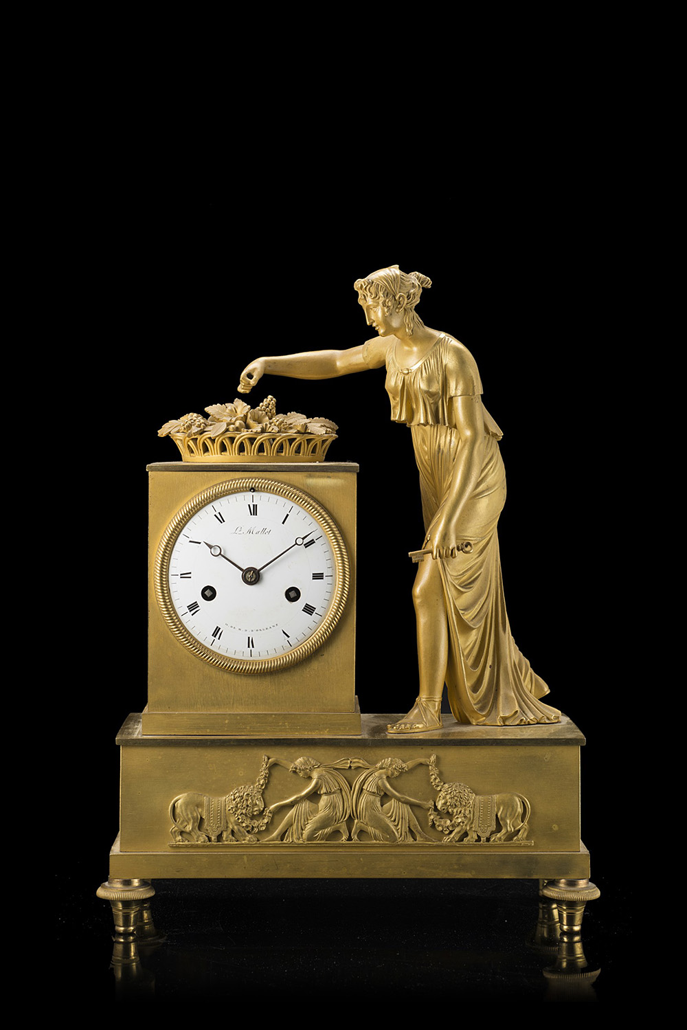 Pendola in bronzo dorato con figura femminile e cesto di fiori