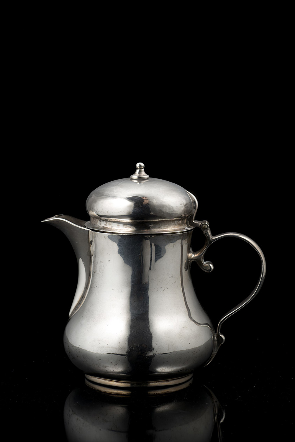 Cuccuma in argento con corpo a balaustro e coperchio bombato, lisci; beccuccio a mensola, manico ad ansa e pomolo tornito. Possibile bottega dello ‘Stato da mar', Repubblica di Venezia, sec. XVIII/XIX (h. cm 12,5 x l. cm 13 ca.) (gr 230 ca.) (difetti)