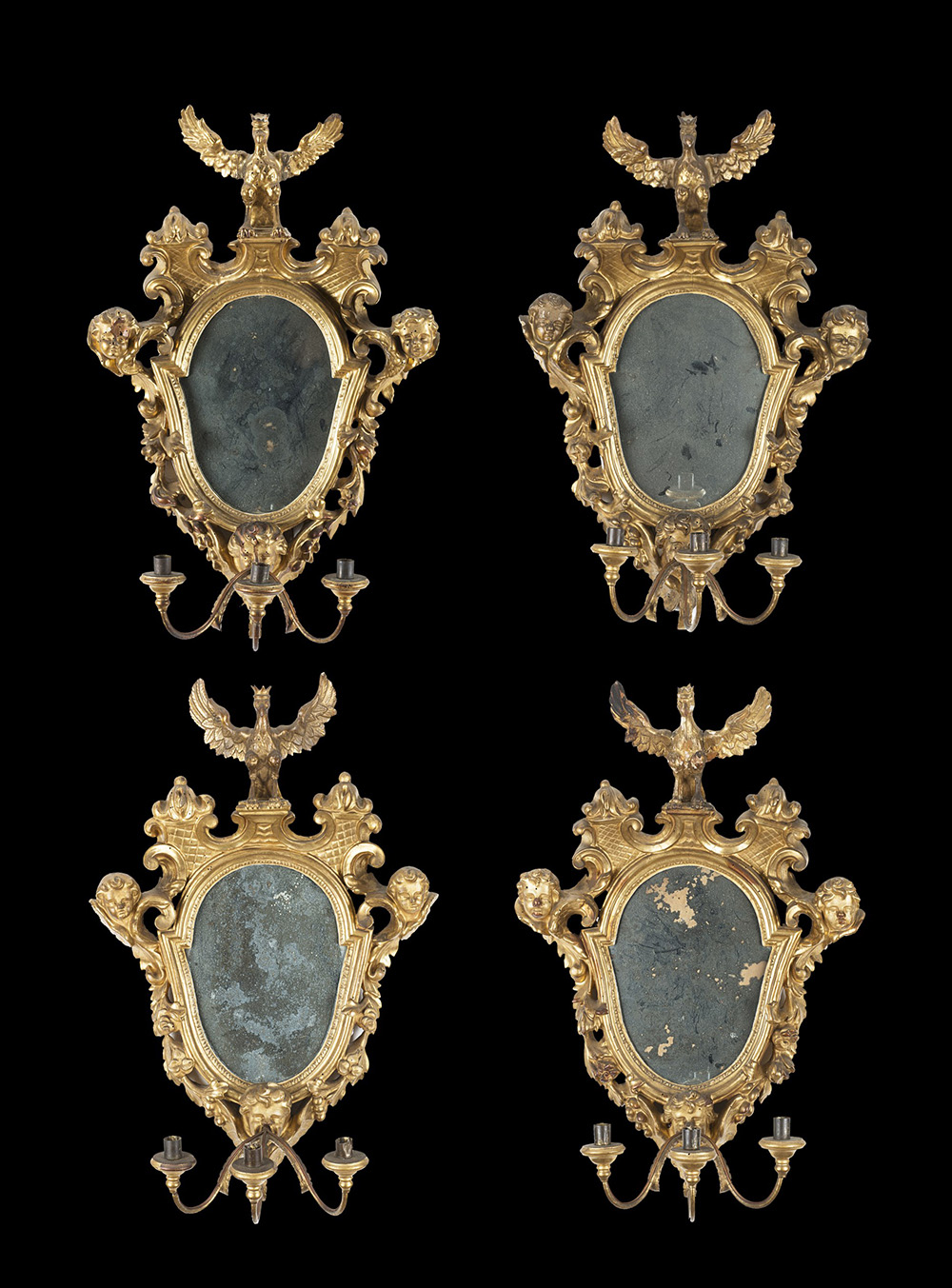 Gruppo di quattro appliques a tre luci in legno intagliato e dorato a teste di putti, fiori e volute (h. cm 75) La cimasa sormontata da aquila coronata ad ali spiegate. Toscana, sec. XVIII (difetti)