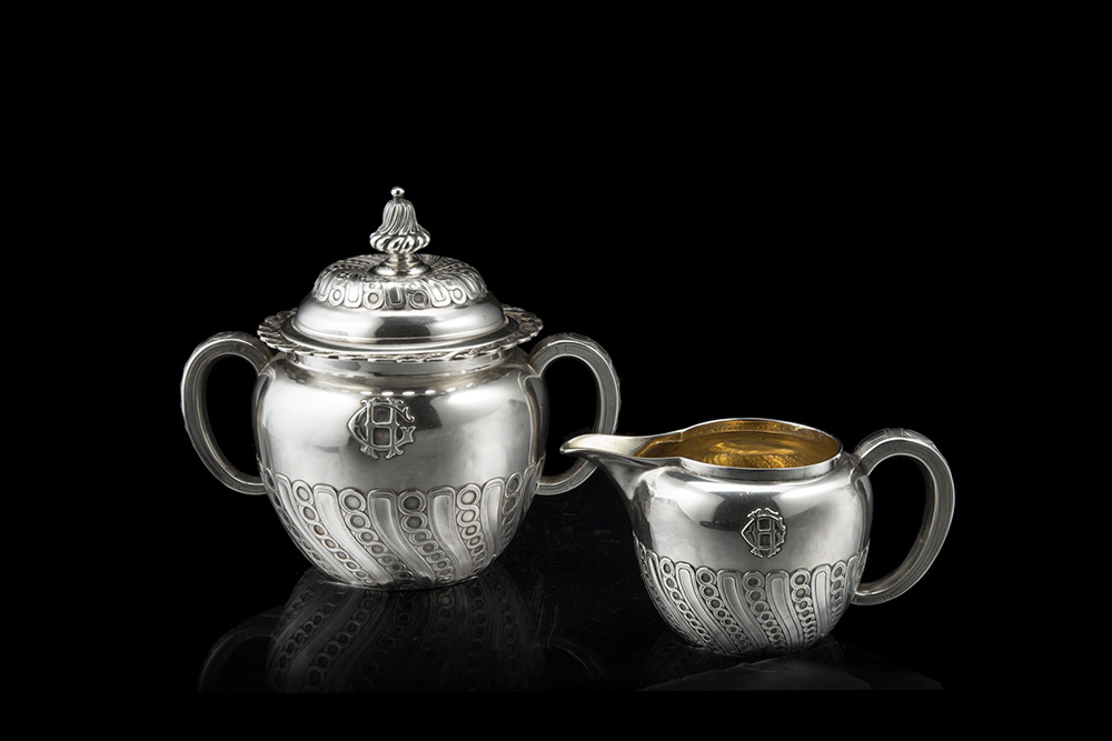 Lattiera e zuccheriera in argento, di forma globulare, decorate con fasce di lambrecchini stilizzati e nastri intrecciati; monogramma applicato 'HG'. Francia, Parigi, argentiere Maison Odiot, pezzi numerati, sec. XX (h. max cm 16,5 ca.) (gr tot 770 ca.) (lievi difetti)