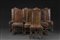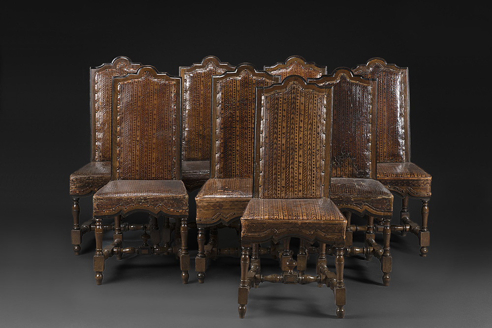 Gruppo di otto sedie in noce, schienale e fasce di di forma sagomata, gambe e traverse a rocchetto. Rivestite in cuoio operato. Lombardia, sec. XVII (difetti e lievi differenze)