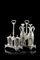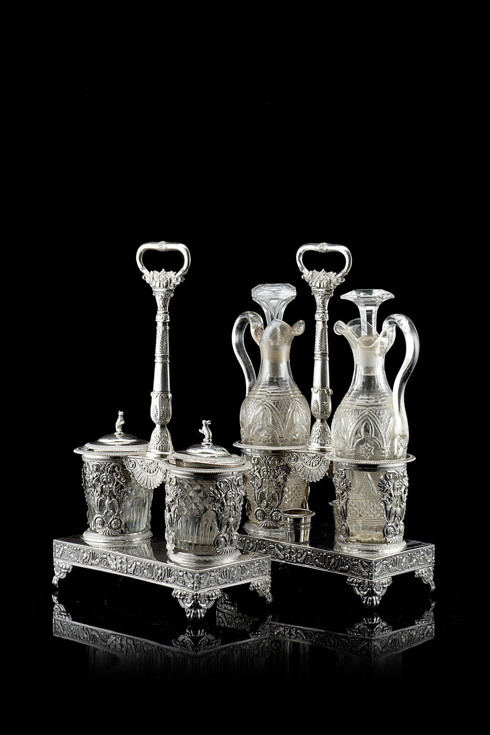 Mostardiera ed oliera in argento con basi rettangolari, cestini a tre montanti traforati e presa a colonna, decorati a motivi zoomorfi e floreali; piedini ferini su sfera e contenitori in vetro molato. Regno di Sardegna, Zecca di Torino, prima metà sec. XIX. Argentiere Matteo Casalegno (h. cm 33 ca.) (gr tot 1010 ca.) (difetti)