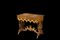 Tavolo da lavoro eclettico con piano e fascia intarsiata a decori geometrici e floreali in noce e acero, cassetto porta cucito nascosto nella fascia anteriore e gambe a giorno riunite da traversa. Il piano, apribile a slittamento, nasconde vani con coperchi incisi e tinti a finta tartaruga, segreti e uno sportello con specchio decorato con scena di battaglia. Piemonte, sec. XIX, alla maniera del Moncalvo (cm 91x78x61) (restauri)