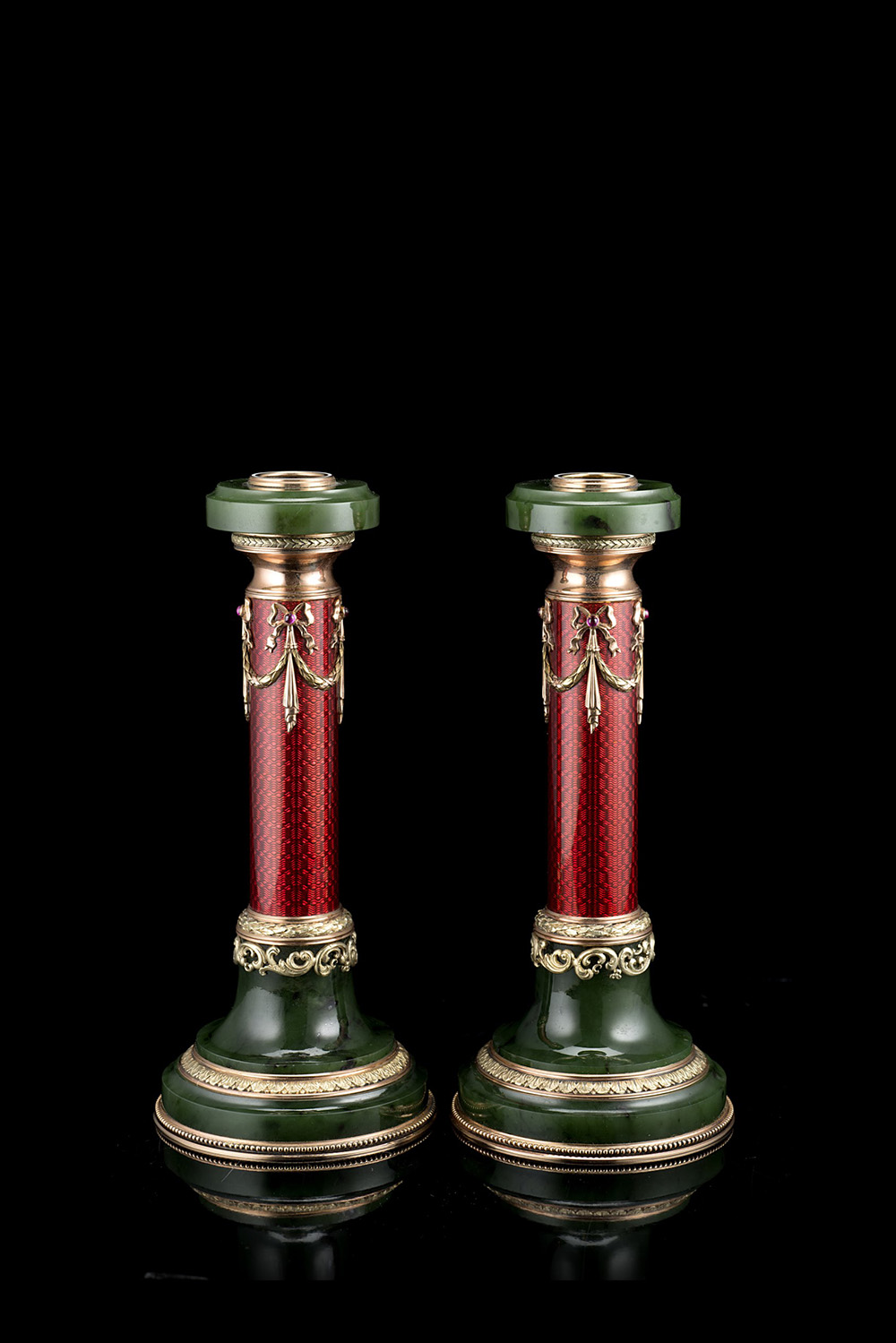 Coppia di candelieri in pietra dura, oro 14K, argento, smalto traslucido rosso e cabochons, decorati a guillochè, festoni, godronature e volute fogliate. Marchi di imitazione di: San Pietroburgo 1908-1927, K. Fabergè e Henrik Wigstrom (h. cm 15 ca.) In custodia marcata Fabergè