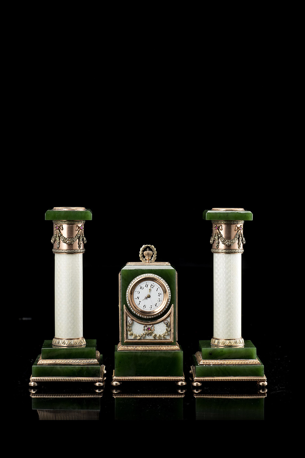 Trittico in pietra dura, oro 14K, smalto traslucido bianco, perline, diamanti e cabochons, composto da un orologio da tavolo di forma rettangolare su plinto e due candelieri con base e bobeche quadrata, e fusto cilindrico, decorati con superfici a guillochè, festoni floreali, nastri, cinture e profili fogliati e perlinati. Marchi di imitazione di: San Pietroburgo della fine del XIX secolo, K. Fabergè e Mikhail Perchin. (cm 10x5,5 ca.) (h. cand cm 13 x 5,5 ca.) (difetti)