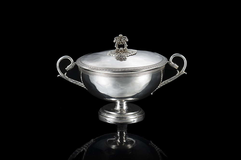 Zuccheriera in argento di forma circolare con coperchio; superficie liscia decorata con cinture godronate, prese ad ansa e pomolo figurati ed interno in vermeil. Torino, 1815-24. Assaggiatore Giuseppe Vernoni. Bollo della bottega di Andrea Stuardi (cm 20,5x h. cm 13 ca.) (gr 460 ca.) (lievi difetti)