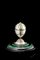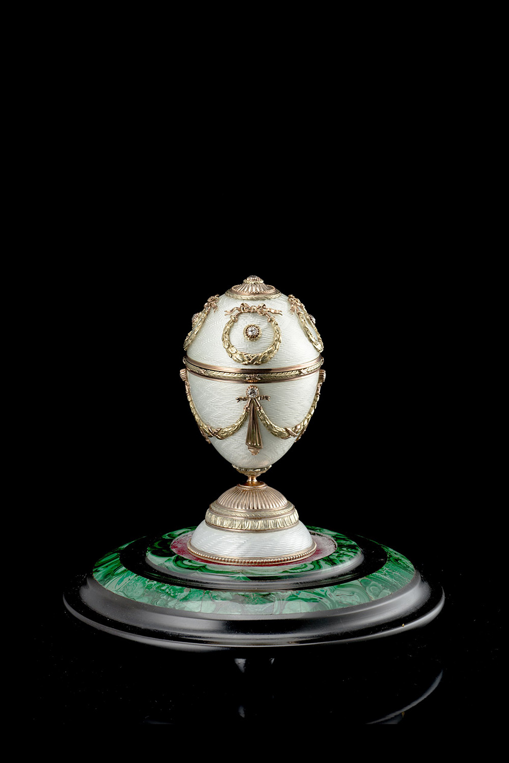 Uovo "imperiale" nello stile di Karl Fabergè, in oro 14K, smalto traslucido bianco e rosso, e diamanti. Corpo su piede circolare rastremato, decorato a guillochè con applicazioni di festoni, rosette entro ghirlande e nastri, cinture fogliate e modanate; contenente al suo interno una chiòccia; base in malachite e pietra nera. Marchi di imitazione di: San Pietroburgo della fine del sec. XIX, K. Fabergè e Mikhail Perchin (base d. cm 14,5 ca., uovo cm 11 ca.) (gr 228 ca.) (lievi difetti)