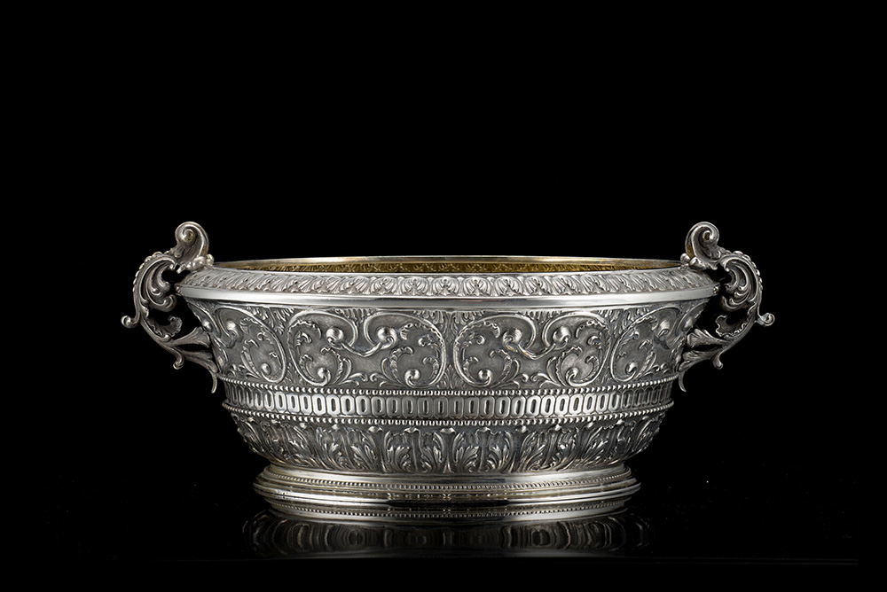 Centrotavola in argento di forma ovale modanata, decorato con foglie d'acanto...