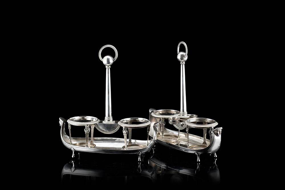 A pair of silver oil cruet with tray. Kingdom of Sardinia, Turin, 1824-73. Silversmith Giovanni Battista Borrani (h. max cm 27,5 ca.; l. 25 ca.) (gr tot 1170 ca.) (defects)