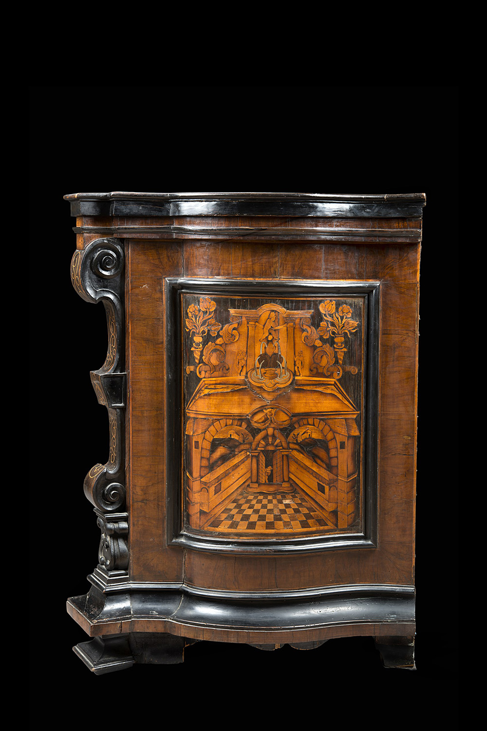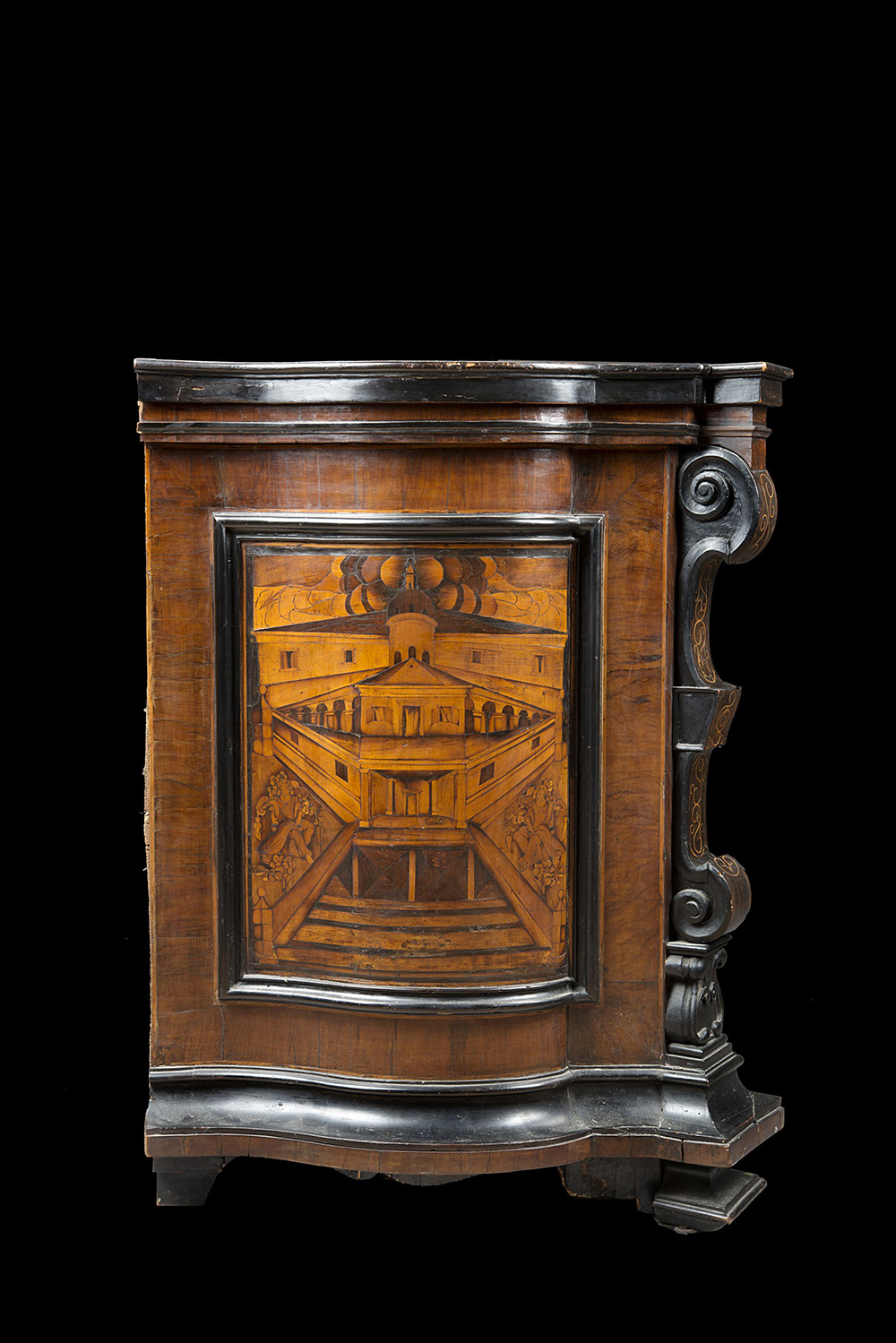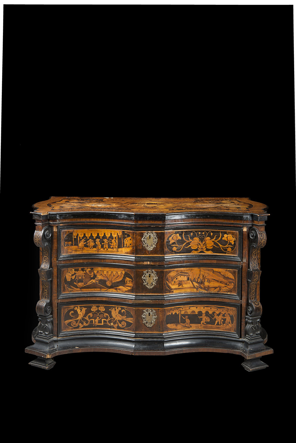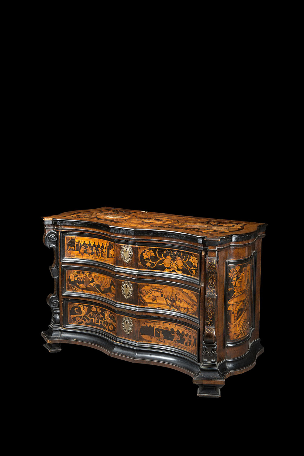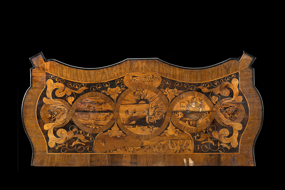 Gli intarsi sono disposti in pannelli appaiati sui cassetti, con scene di genere e floreali; sui fianchi rappresentano invece due vedute architettoniche mentre sul piano sono altri paesaggi con figure fra intrecci di foglie e girali. Lombardo-Veneto, ultimo quarto del XVII secolo
