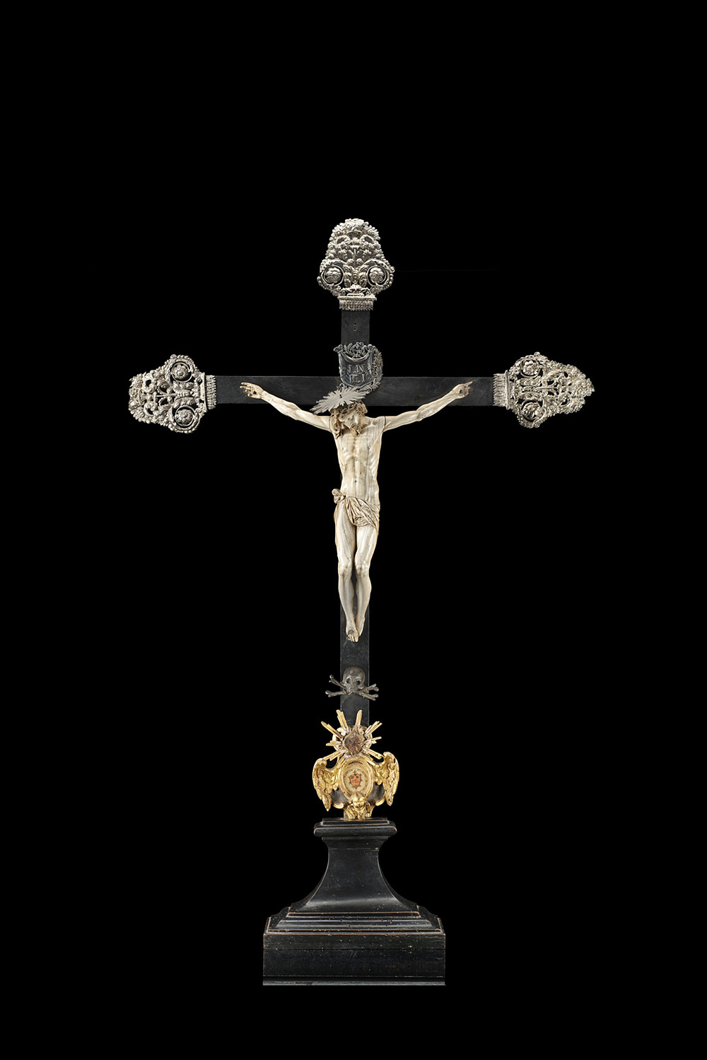 Crocefisso in avorio su croce in legno ebanizzato con puntali in argento sbalzato a motivi floreali e volute. "Vanitas" ai piedi del Cristo in argento. Punzoni genovesi inizio sec. XIX. Unito a un reliquiario in legno intagliato e dorato alla base (difetti e mancanze)