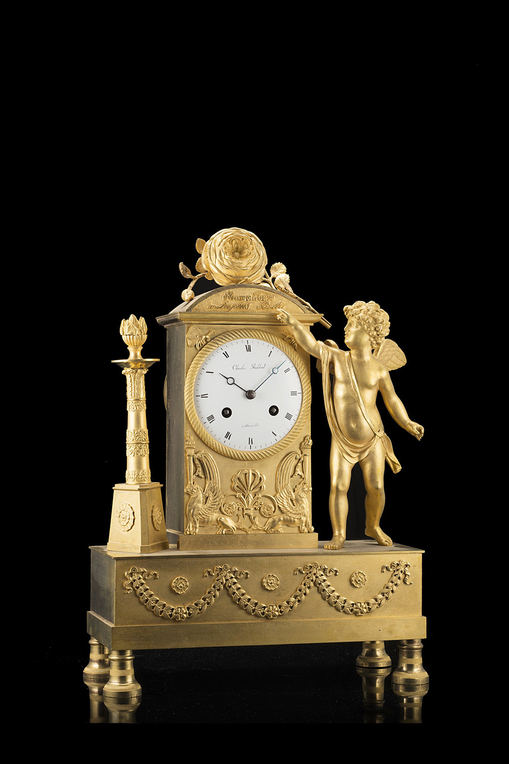 Pendola in bronzo dorato di struttura architettonica, con iscrizione "Hommage à la plus belle"