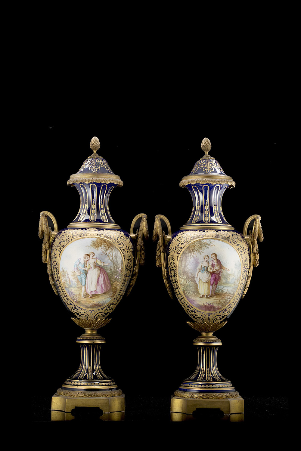 Manifattura di Sèvres, fine sec. XIX. Coppia di vasi a balaustro in porcellana con montatura in bronzo dorato. Il fondo è in blu cobalto con ricche applicazioni in oro a rilievo. Sul corpo ovoidale sono dipinte scene galanti incorniciate da un ricco medaglione a ricamo in oro rilevato e sul retro medaglioni dorati con paesaggi. Le due scene galanti recano la firma del pittore L. Bertren. All'interno dei coperchi compare la marca di fabbrica e la scritta "Offert par le Duc de Lauzun a Madame de Compar" (h. cm 82) Sotto al piede è presente la marca di fabbrica (difetti)