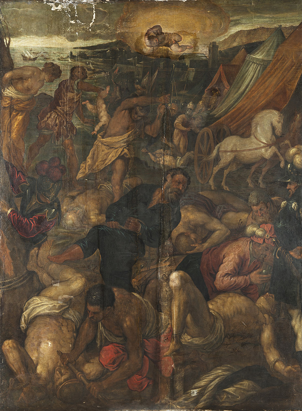 16th-venetian Master "The scene after the battle" oil on canvas (cm 298x205) framed (defects and restauration)