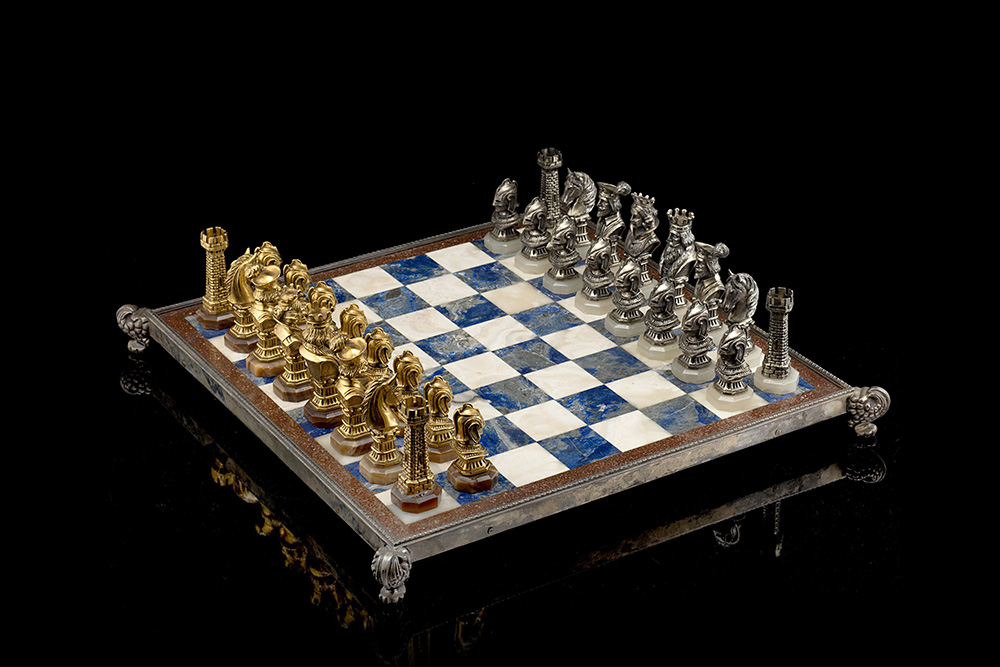 Scacchiera con trentadue pezzi, in argento, lapislazzuli ed alabastro....