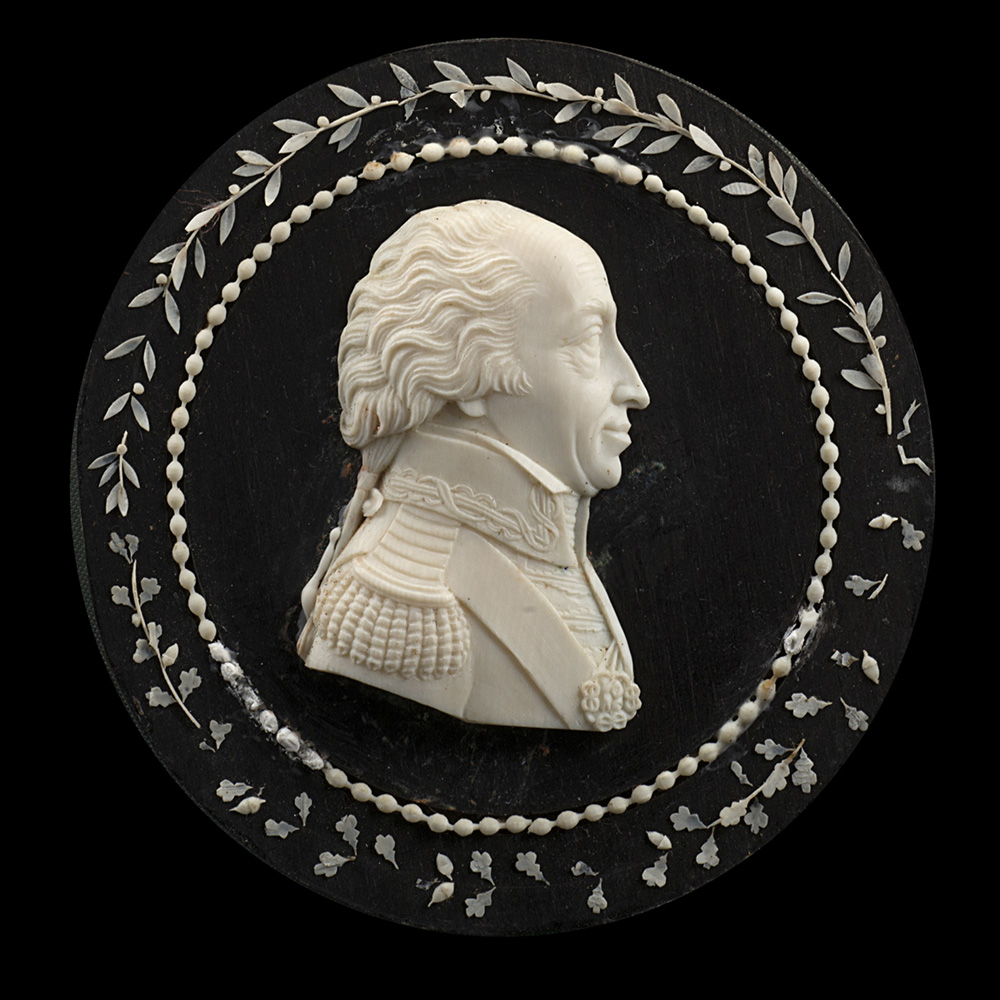 "Vittorio Emanuele I" intaglio in avorio su supporto ebanizzato, iscritto al retro Adèle Morra à son Père Charly 1849" (d. cm 7) In cornice in legno (difetti e mancanze)