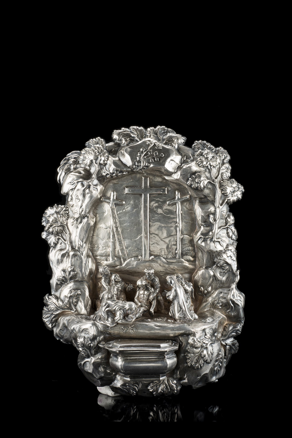 Rara acquasantiera in argento con gruppo a getto raffigurante la Deposizione...