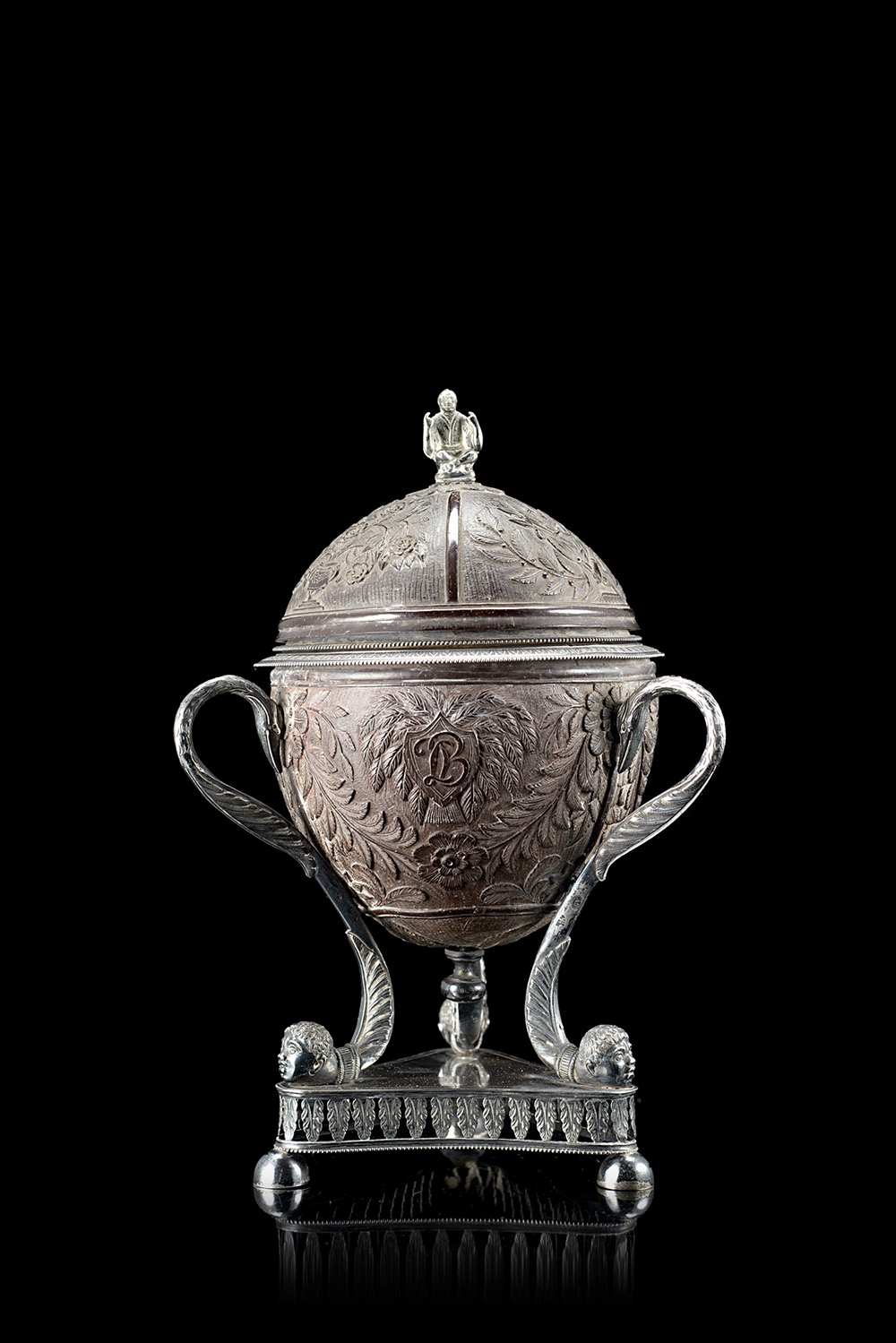 Zuccheriera in argento con coperchio e copertura ricavata da una noce di cocco intagliata con armi nuziali sotto corona comitale, con monogramma 'LB' attribuibile a Luigi Bonaparte in scudo su fascio di grano e monogramma 'DB' in scudo su tralci d'uva, e motivi floreali; base tripode su plinto con fascia traforata a palmette, montanti a doppia voluta, con prese zoomorfe a collo di cigno e piedini antropomorfi a testa di indigeno; pomolo a tutto tondo in figura di orientale in preghiera. Marchi del Regno di Sardegna, Zecca di Torino, assaggiatore Giuseppe Vernoni, argentiere Andrea Stuardi, 1815-24 (h. cm 21,5 ca.; lungh. max cm 14,5 ca.) (gr lordi 670 ca.) (difetti)