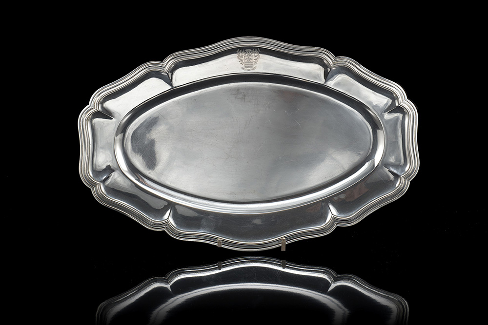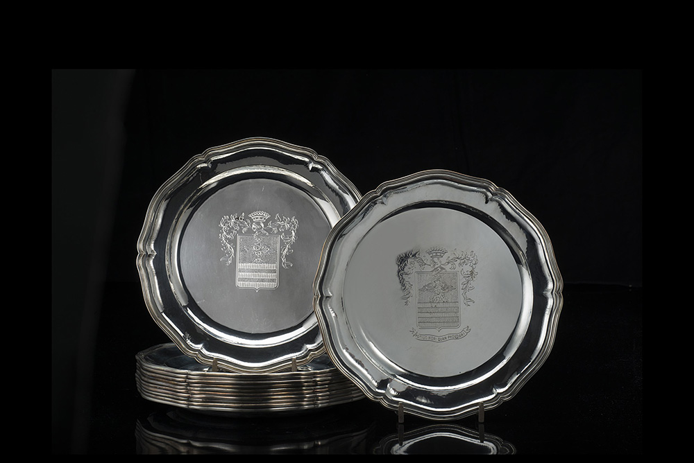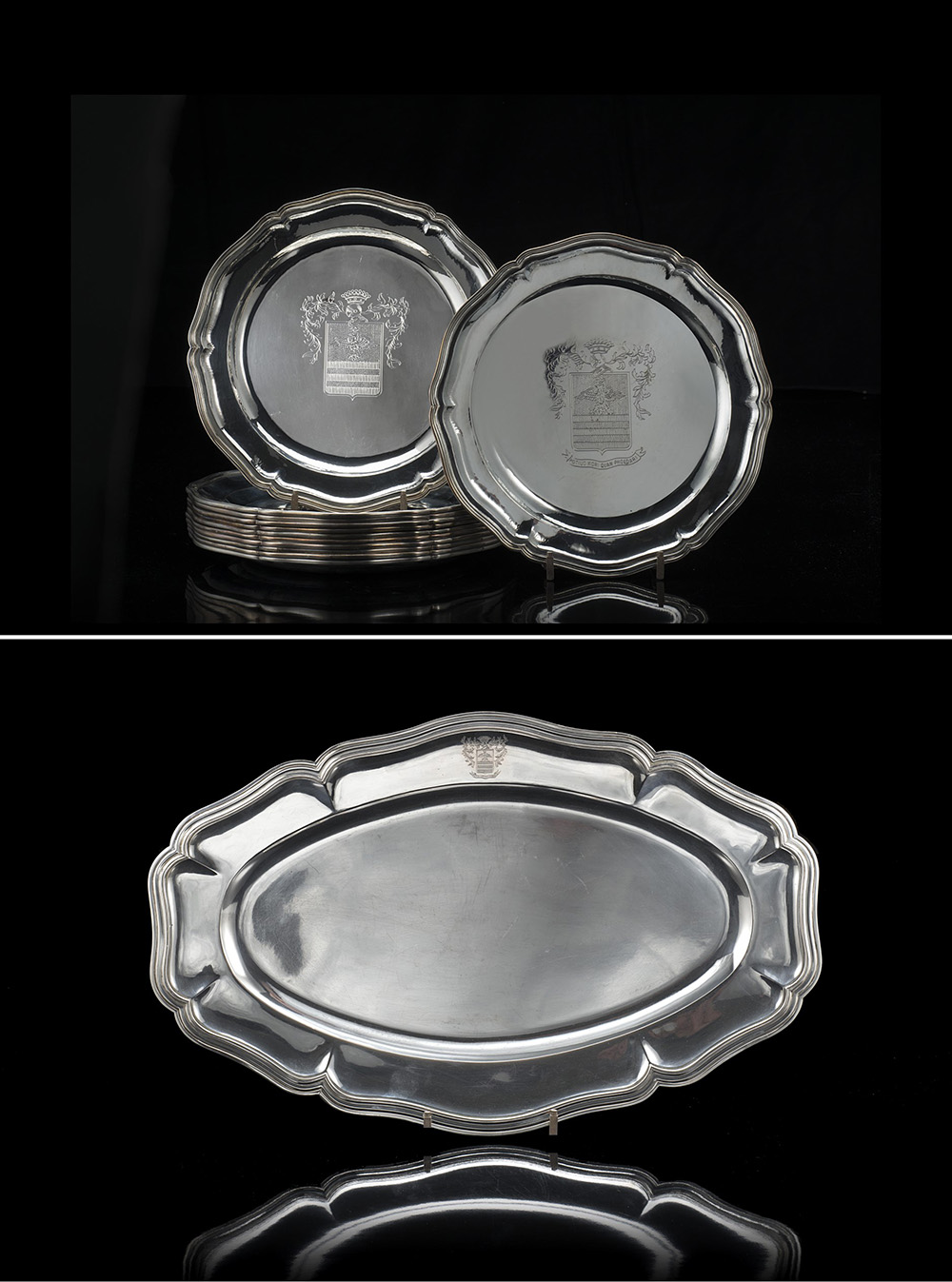Lotto in argento composto da un vassoio di forma ovale e dodici piatti di forma circolare, sagomati, con superficie liscia incisa, tesa nervata e bordura modanata; stemma con motto 'POTIUS MORI QUAM PHOEDARI'. Italia, sec. XX (vassoio cm 51,5x 32,5 ca.; piatto d. cm 30 ca.) (gr tot 8550 ca.) (difetti)
