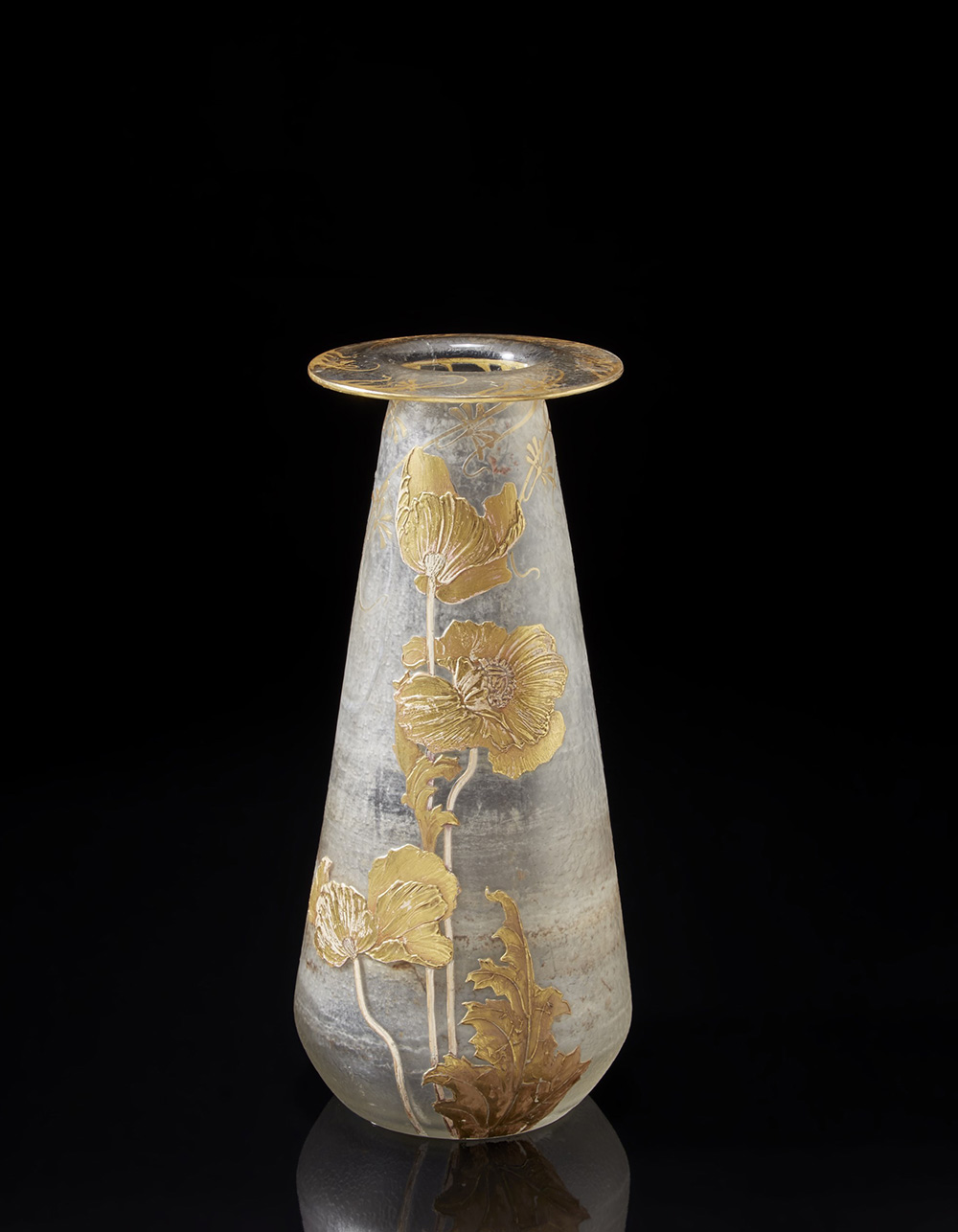 Vaso di forma troncoconica con orlo allargato, in vetro incolore inciso all'acido e decorato con motivi floreali a rilievo smaltati e dorati. Inizio sec. XX (h. cm 41) (difetti)