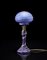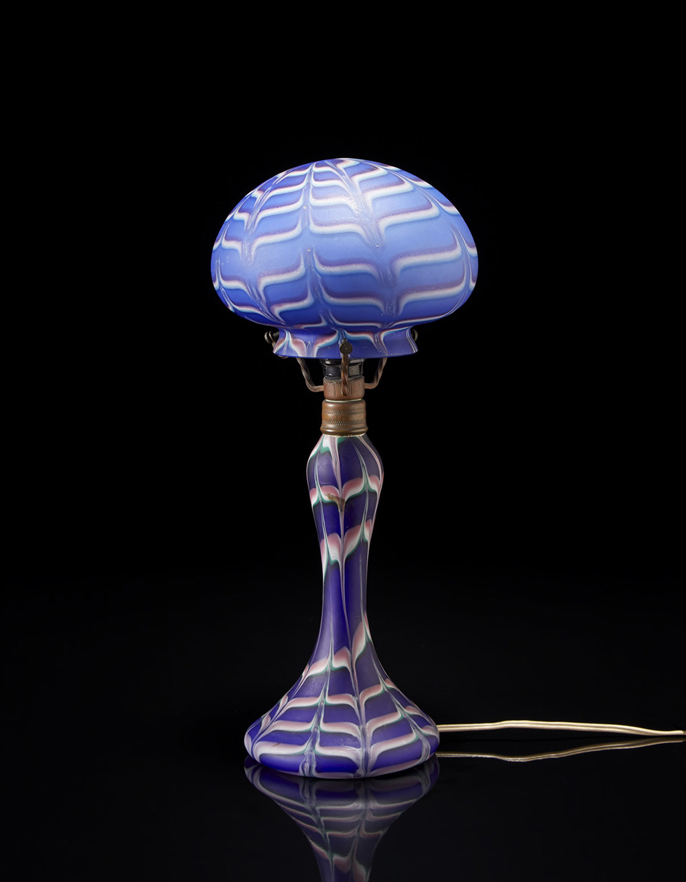 Lampada con fusto e paralume in vetro policromo a decoro "fenicio" soffiato e satinato sulla superficie esterna. Prima metà del sec. XX (h. cm 35)