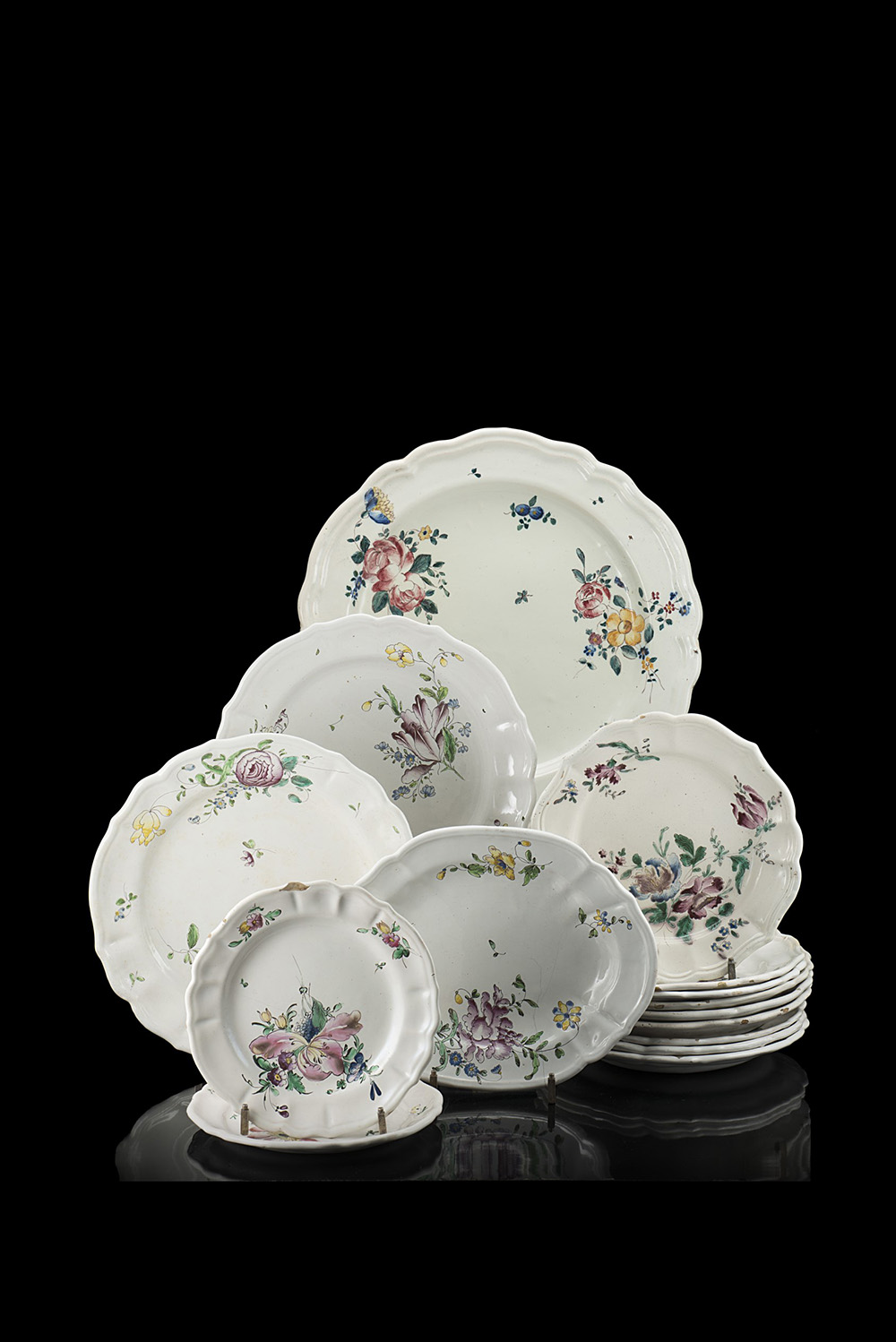 Manifattura di Lodi. Parte di servizio di piatti in maiolica decorata in policromia a fiori composto da vassoio, vassoietto, piatti di misure ed epoche diverse (difetti) Alcuni con marchio "chiodo" sotto smalto
