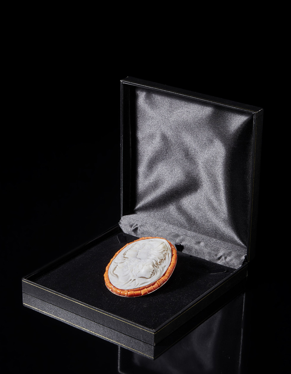 Grande cammeo raffigurante profili di fanciulle entro cornice decorata con applicazioni in corallo. Firmato Confuorto a tergo (cm 10x8) In custodia